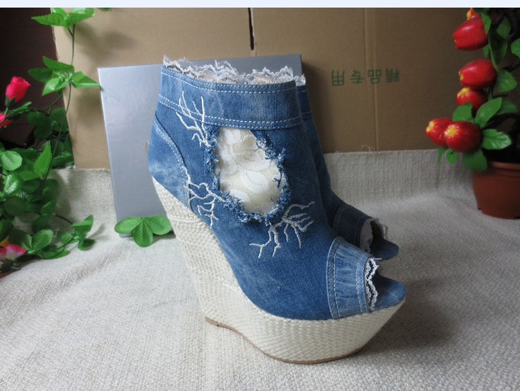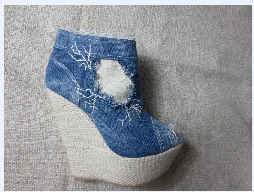 - Fashion Element: Lace Trim Peep-toe, Embroidered Vines, Hollow-cut Frayed Holes, Inside Zipper, Wedge